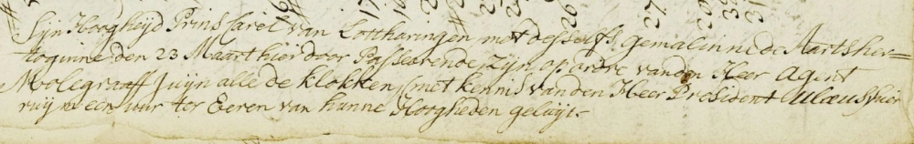 The sexton’s burial registers in Tilburg also mention other events, which were less related to individual residents and more to “big news.” For example, the sexton noted several times that he rang the church bells because dignitaries were visiting or passing through the city. On 23 March 1744 it was Charles of Lorraine and his wife who passed through the city on their way to Brussels. For an hour the sexton rang all the bells in the church tower.